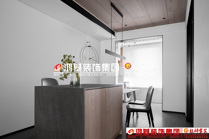 圖3.4.亮點(diǎn):餐廳以獨(dú)特的條形吊燈和掛鐘來烘托空間氛圍,使用餐桌+島臺(tái)一起設(shè)計(jì),這樣不僅可以擴(kuò)展操作臺(tái)充當(dāng)餐桌輔助,也可以作為作為閱讀辦公區(qū)域使用。廚房以實(shí)用為先,使用了常用的“L”型布局,充分利用拐角地帶,實(shí)現(xiàn)空間利用率的最大化。