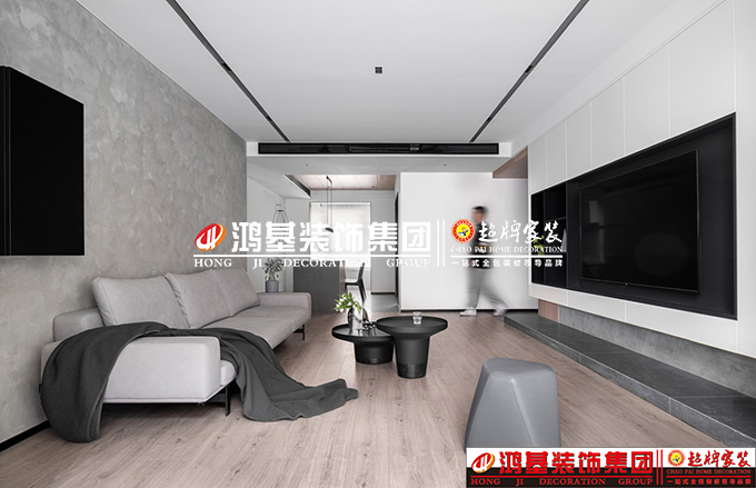 圖1.2.亮點(diǎn):關(guān)區(qū)域做了常規(guī)處理,在入戶的右側(cè)我們做了鞋柜來滿足日常使用。左側(cè)的墻為一整面kd板墻,延伸到了客廳電視墻,使得兩個(gè)區(qū)域相呼應(yīng)。我們將客廳整面墻做滿柜子,讓電視嵌于中間,將開放性和封閉型柜子做組合,開放格做展示區(qū),零碎的雜物關(guān)在門內(nèi)。