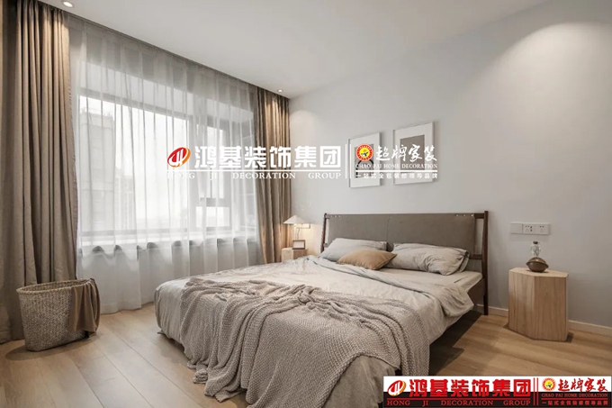 主臥,極簡(jiǎn)的墻頂面設(shè)計(jì)搭配原木地板,裝飾畫修飾床背景,灰褐色大床搭配卡其窗簾,低飽和的色彩制造舒眠環(huán)境。